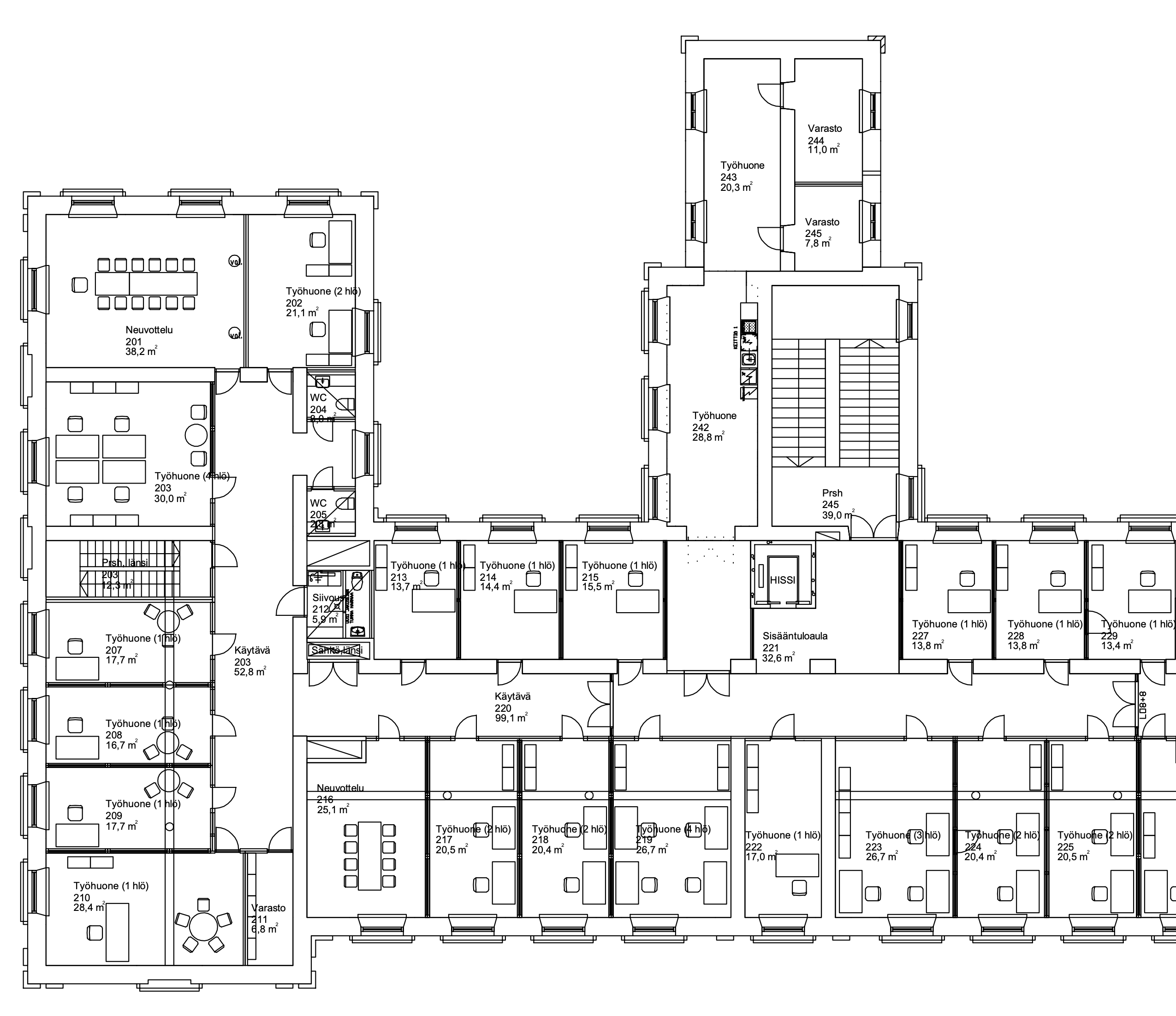 - 25 äänieristettyä eri kokoista työhuonetta – rauhalliset puitteet keskittymiseen tai tiimityöhön